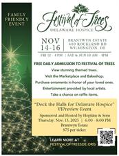 Join us for the Delaware Hospice Festival of Trees to be held November 14 (noon-4pm) and November 15&16 from 10am-4pm at Brantwyn Estate, 600 Rockland Road, Wilmington, DE. Enjoy beautifully decorated trees, marketplace for holiday decor and gifts, bakeshop and raffles. Free Admission. There is also a VIPreview event Thursday evening that is ticketed. More information is available at www.festivaloftreesde.org.